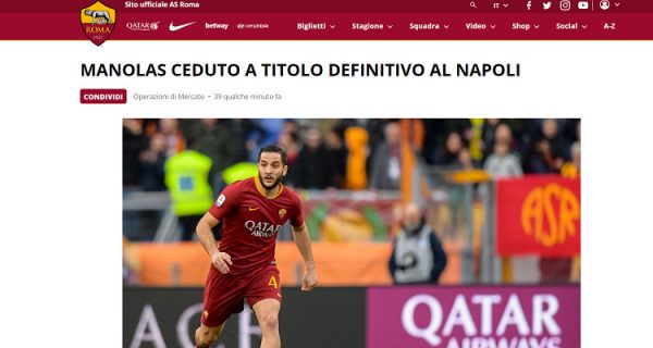 “Kostas Manolas per Amadou Diawara: l’accordo tra Roma e Napoli è stato definitivamente raggiunto. Il difensore greco, infatti, ha risolto nelle scorse ore gli ultimi dettagli del suo nuovo contratto con il club azzurro, che lo acquista a titolo definitivo per 36 milioni di euro.