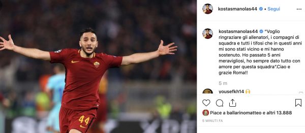 Il neo difensore azzurro Kostas Manolas ha pubblicato un post sul suo profilo Instagram in cui ringrazia i tifosi e la società della Roma per gli ultimi 5 anni vissuti in giallorosso.