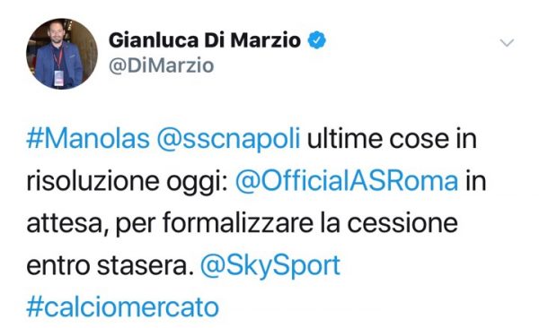 “Manolas-Napoli, ultime cose in risoluzione oggi: Roma in attesa per formalizzare la cessione entro stasera”.