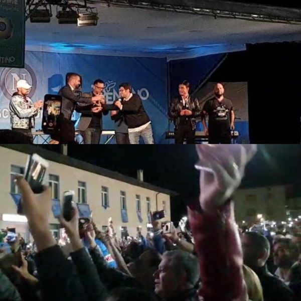 Edoardo De Laurentiis, vice presidente del Napoli, è salito sul palco e ha ringraziato tutti per la bellissima atmosfera, immediatamente dopo è partito il famoso coro “Napoli torna campione“, che ha fatto saltare ed esaltare tifosi e non, tra i tanti anche Insigne e Gaetano che hanno iniziato a saltare e cantare.