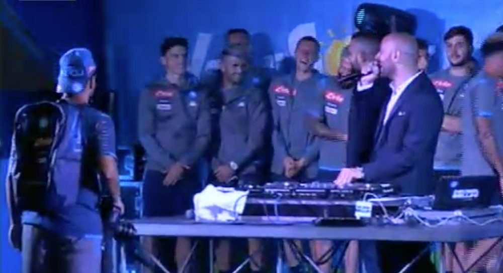 21.30 – Tommaso Starace Show! Il Magazziniere del Napoli viene chiamato sul palco e inizia un ballo particolare coinvolgendo i calciatori azzurri! (GUARDA QUI). Dopodiché i calciatori cantano “‘O Surdato ‘Nnammurato” e saltano al coro “chi non salta è juventino!” (IL VIDEO). Ancelotti grida un fortissimo “Forza Napoli!”.