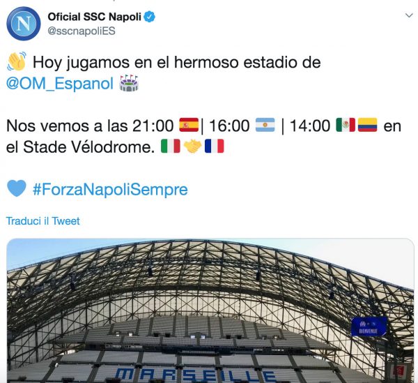Poco fa, infatti, sull’account spagnolo del Napoli su Twitter, il club ha ricordato l’appuntamento di questa sera con il Marsiglia in amichevole. Nulla di strano, direte. E invece la particolarità sta nel fatto che nel testo del messaggio la società partenopea si sia premurata di ricordare gli orari del match in tre particolari paese latini: l’Argentina, il Messico e la Colombia. Con tanto di bandiere delle suddette nazioni.