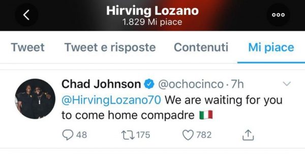 Il campione di football americano, Chad Johnson, ha pubblicato un tweet sul proprio account ufficiale nel quale si faceva riferimento all’imminente arrivo del calciatore messicano in Italia.