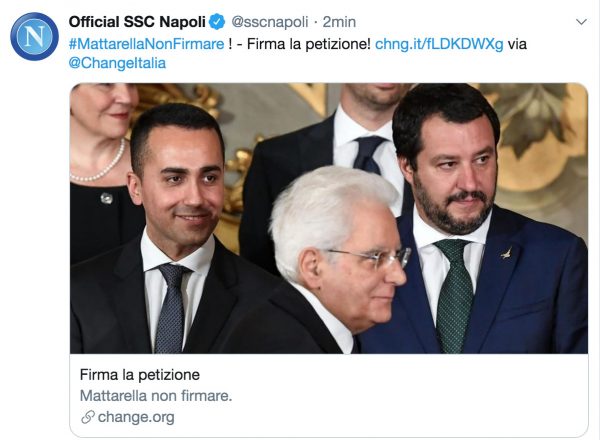 Pochi minuti dopo, però, lo stesso tweet è stato eliminato e dal profilo del club partenopeo è comparso un messaggio di rettifica: “La SSC Napoli non ha segnalato volontariamente alcuna petizione. Cercheremo di capire come mai è comparso un tweet non voluto sul nostro profilo. Ci scusiamo con i followers“.