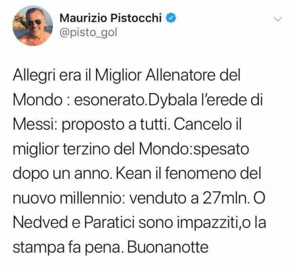Duro e polemico, uno degli ultimi Tweet di Maurizio Pistocchi. Allegri, Cancelo, Dybala, Kean. Quattro elementi juventini, o ex, considerati fenomeni dalla stampa e mandati via dalla società bianconera.