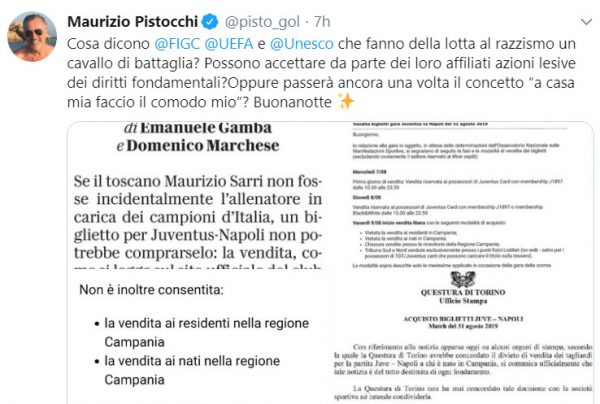 Maurizio Pistocchi, tramite il proprio profilo Twitter, ha parlato della vicenda biglietti per Juventus-Napoli alla seconda giornata di campionato. Ecco il tweet: