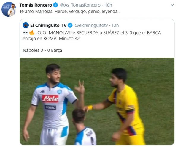 I due giocarono contro l’ultima partita nei quarti di Champions League e l’allora squadra di Manolas, la Roma, vinse per tre reti a zero e l’ultima venne siglata proprio dal difensore oggi in forza agli azzurri. Il gesto del numero 44 non è di certo passato inosservato e ha scatenato i social nei commenti. Uno dei più divertenti arriva dalla spagna da parte di Tomas Roncero, collega di AS, tramite il suo account di Twitter: