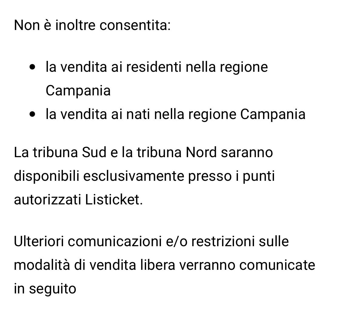 Appena sei giorni fa sul sito della Juve c’era la pubblicazione di un comunicato dove era vietata la vendita ai tifosi NATI in Campania. Da lì è nata una grossa polemica.