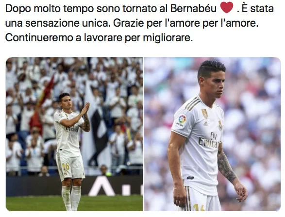 James Rodriguez si allontana dal Napoli. Il colombiano è stato sostituito dopo 55′ minuti di gara da Zidane che ci ha tenuto a precisare che lo ha cambiato per un problema muscolare. Il calciatore al termine della gara, pareggiata tra l’altro dal Real Madrid col Valladolid (1-1), ha postato due foto su twitter, lanciando un chiaro segnale: