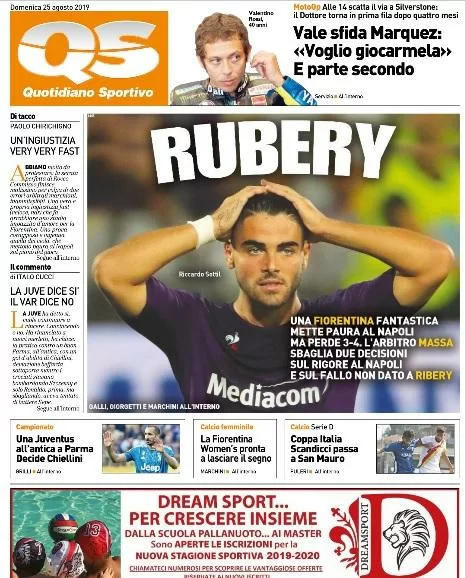 Il titolo dell’inserto sportivo, Quotidiano Sportivo, infatti, non lascia spazio alla fantasia: “Rubery”, si legge, in un gioco di parole tra le decisioni arbitrali e l’ultimo arrivato in casa Fiorentina.