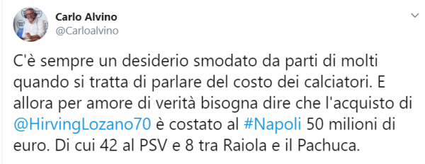 “C’è sempre un desiderio smodato da parti di molti quando si tratta di parlare del costo dei calciatori. E allora per amore di verità bisogna dire che l’acquisto di Hirving Lozano è costato al Napoli 50 milioni di euro. Di cui 42 al PSV e 8 tra Raiola e il Pachuca“.