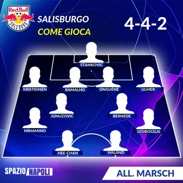 Il Red Bull Salisburgo ha un nuovo allenatore, ad ereditare il ruolo di Marco Rose è sopraggiunto l’americano Jesse Marsch, ma nulla è cambiato. La squadra continua ad essere la più vincente del campionato. Il nuovo tecnico predilige il 4-4-2. La coppia d’attacco su cui fa maggior affidamento è quella composta da Hwang e Haland, così come Stankovic tra i pali. La difesa a quattro è solita vedere schierati rispettivamente gli esterni Kristensen e Ulmer. A centrocampo Minamino detiene lo scettro da titolare, le ha giocate tutte fin’ora. Al suo fianco, sulla fascia opposta Szoboszlai. Questa l’ipotetica formazione che affronterà il Napoli: