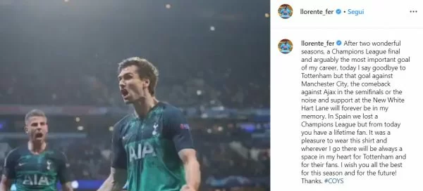 “Dopo due meravigliose stagione, una finale di Champions e probabilmente il gol più importante della mia carriera dico addio al Tottenham. Abbiamo perso una finale di Champions, ma il Tottenham ha trovato in me un nuovo tifoso a vita. È stato un onore poter indossare quella maglia, vi porterò per sempre nel mio cuore“.