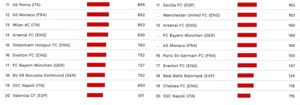 Nel 2019, l’Atletico Madrid è la squadra che ha speso di più, precisamente 329 milioni di euro. A seguire Real Madrid (324), Barcellona (256), Inter (212), Juventus (186) e Milan (183). Completa il quadro delle italiane il Napoli, che si posiziona alla 20ma posizione, con 115 milioni investiti.