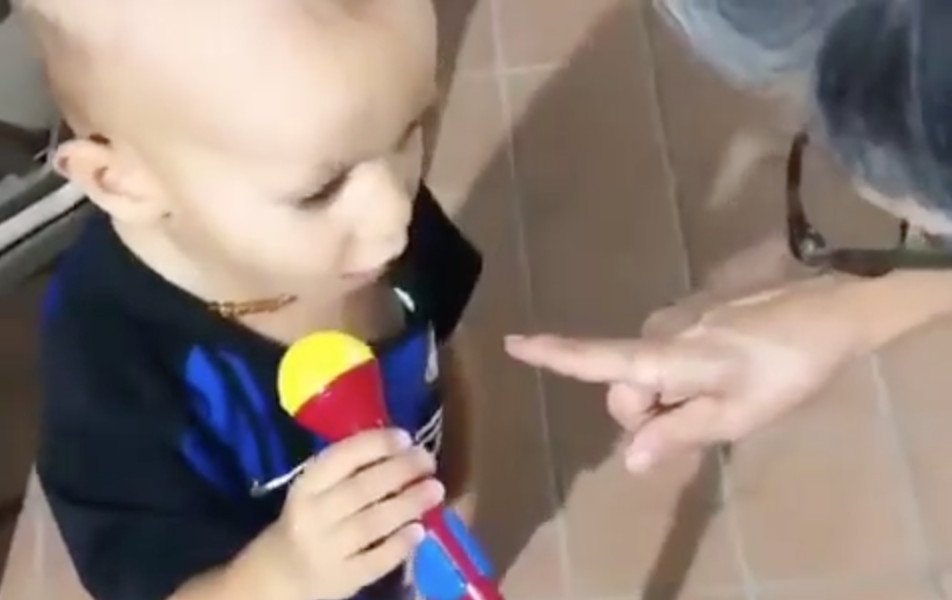 Il figlioletto del giocatore dell’Inter, infatti, è intento a cantare l’inno dei neroazzurri “Pazza Inter Amala”. I nonni nel mentre cercano in tutti i modi di convertirlo e riportarlo alle origini napoletane.