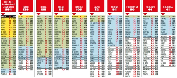 Il Napoli, in questa speciale classifica si attesta al quinto posto. Il club di Aurelio De Laurentiis, ha superato il tetto dei 100 milioni (103 milioni netti, ndr) l’anno d’ingaggi ai calciatori. Le squadre che precedono gli azzurri, come detto, sono ben quattro. La Juventus (294), l’Inter (139), la Roma (125) e il Milan (115).