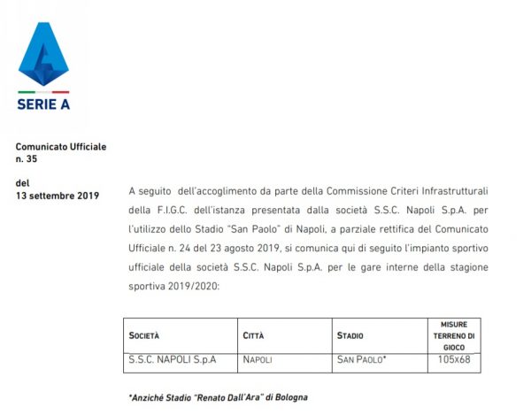 A seguito dell’accoglimento da parte della Commissione Criteri Infrastrutturali della F.I.G.C. dell’istanza presentata dalla società S.S.C. Napoli S.p.A. per l’utilizzo dello Stadio “San Paolo” di Napoli, a parziale rettifica del Comunicato Ufficiale n. 24 del 23 agosto 2019, si comunica qui di seguito l’impianto sportivo ufficiale della società S.S.C. Napoli S.p.A. per le gare interne della stagione sportiva 2019/2020: