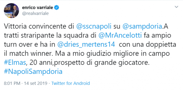 “Vittoria convincente del Napoli sulla Samp. A tratti straripante la squadra di Ancelotti, fa ampio turn over e ha in Dries Mertens con una doppietta il match winner. Ma a mio giudizio Elmas è stato migliore in campo, 20 anni, prospetto di grande giocatore”.