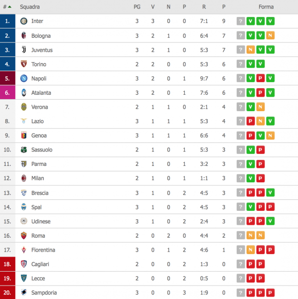 Fanno rumore le sconfitte di Lazio, che in vantaggio, si fa rimontare 2-1 dalla Spal, e Brescia che passa dal 3-1 del primo tempo al 3-4 di fine gara con il Bologna. Bella vittoria anche del Cagliari che batte a domicilio 1-3 il Parma, gara terminata dopo ben 12 minuti di recupero!
