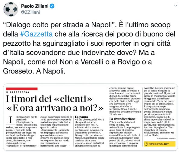 Il giornalista Paolo Ziliani ha ripreso l’articolo de La Gazzetta dello Sport, scrivendo un forte commento su Twitter, specificando come sia ‘strano’ che il quotidiano abbia deciso di puntare i fari sulla città di Napoli per parlare della lotta alla pirateria televisiva: