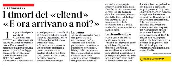 La lotta al ‘pezzotto‘ è stato un tema trattato anche sull’edizione odierna de La Gazzetta dello Sport, con un dialogo colto tra le strade di Napoli, con alcuni “clienti” adesso impauriti di essere scoperti.