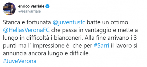 ULTIMISSIME CALCIO NAPOLI – Enrico Varriale, giornalista RAI, commenta la partita appena conclusasi tra Juventus e Verona, che la visto vincente la formazione di Sarri. Nonostante i 3 punti, non mancano le critiche a Sarri.