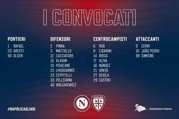 News Napoli calcio / Il Cagliari ha diramato la lista ufficiale dei convocati per il match del San Paolo contro il Napoli. Di seguito la lista completa dei convocati: