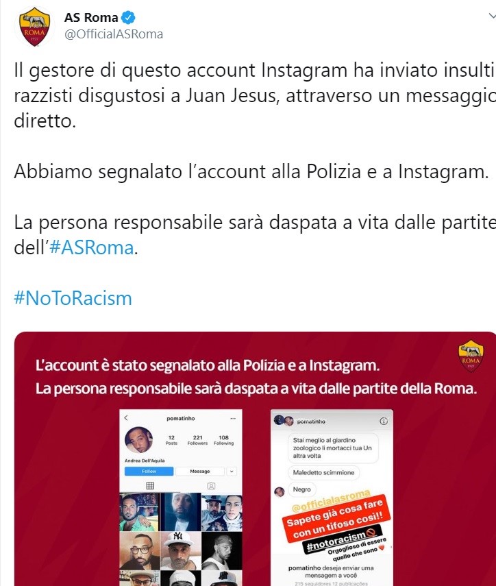 Istantanea la risposta della squadra capitolina che tramite il proprio account Twitter ufficiale ha denunciato l’accaduto e comunicato di aver preso provvedimenti drastici nei confronti dell’individuo, al quale è stato bloccato l’account Instagram e soprattutto non gli sarà più data possibilità d’accesso alle partite della Roma.