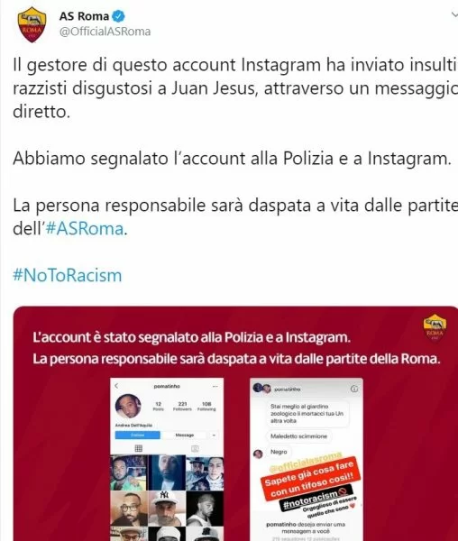 Istantanea la risposta della squadra capitolina che tramite il proprio account Twitter ufficiale ha denunciato l’accaduto e comunicato di aver preso provvedimenti drastici nei confronti dell’individuo, al quale è stato bloccato l’account Instagram e soprattutto non gli sarà più data possibilità d’accesso alle partite della Roma.