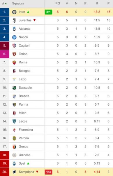 L’Inter che continua a macinare punti e a non perdere colpi, portando a casa la sesta vittoria su sei gare in questo avvio di campionato. Così la classifica ora recita Inter 18, Juventus 16, Atalanta 10 e Napoli 9 (con una gara da disputare domani).
