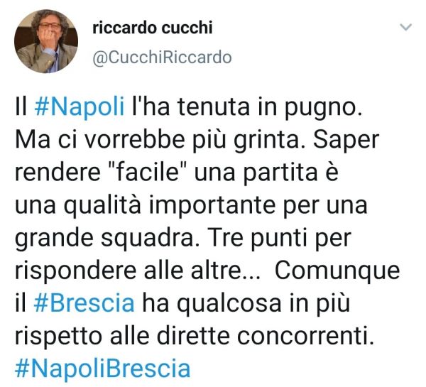 Riccardo Cucchi, radiocronista della Rai, ha commentato tramite il suo profilo Twitter la vittoria del Napoli contro il Brescia per 2-1. Ecco il Tweet: