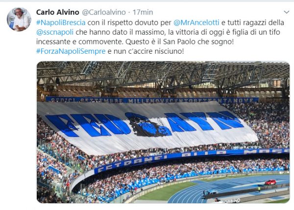 “#NapoliBrescia con il rispetto dovuto per @MrAncelotti e tutti ragazzi della @sscnapoli che hanno dato il massimo, la vittoria di oggi è figlia di un tifo incessante e commovente. Questo è il San Paolo che sogno! #ForzaNapoliSempre e nun c’accire nisciuno!”