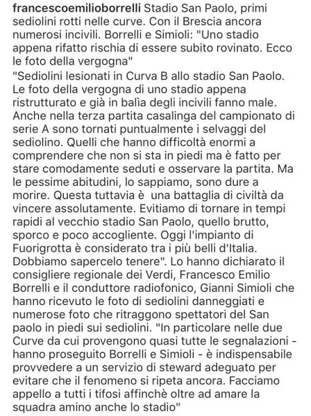 “Sediolini lesionati in Curva B allo stadio San Paolo. Le foto della vergogna di uno stadio appena ristrutturato e già in balìa degli incivili fanno male. Anche nella terza partita casalinga del campionato di serie A sono tornati puntualmente i selvaggi del sediolino.