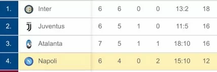 Per il Napoli la classifica non cambia: l’Atalanta resta su e aggancia momentaneamente la Juventus a quota 16 punti, mentre Roma e Lazio inseguono a 12 e 11 punti. Adesso toccherà ai ragazzi di mister Ancelotti riuscire ad accorciare nuovamente sui nerazzurri e staccarsi dai due club capitolini.