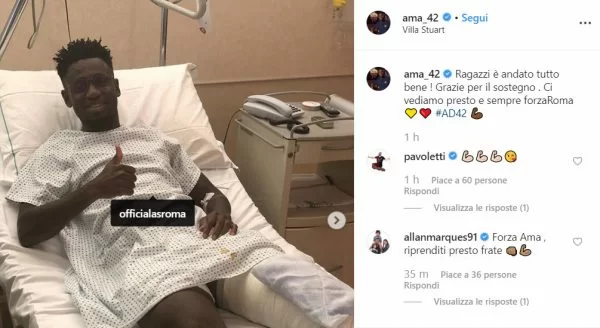 L’operazione è riuscita e ora inizierà la convalescenza, che sarà di circa 1-2 mesi. Intanto, Diawara ha postato la foto su Instagram ed è stato sommerso di commenti di affetto e vicinanza. Anche alcuni azzurri, tra cui Allan, Meret e Luperto, hanno commentato.