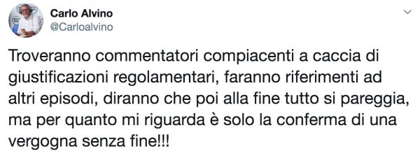 Molto duro il commento di Alvino su Twitter: “Troveranno commentatori compiacenti a caccia di giustificazioni regolamentari, faranno riferimenti ad altri episodi, diranno che poi alla fine tutto si pareggia, ma per quanto mi riguarda è solo la conferma di una vergogna senza fine!!!“.