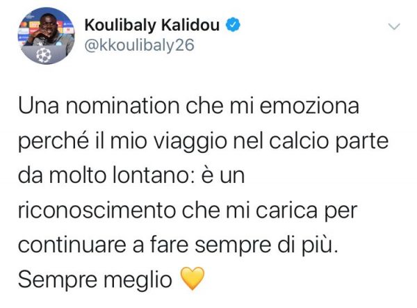 Kalidou Koulibaly in occasione della sua candidatura al Pallone D’Oro 2019 ha scritto sul suo canale Twitter: