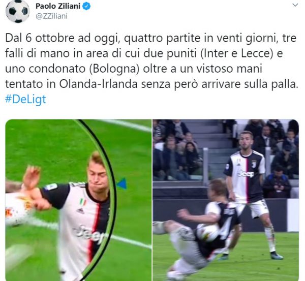 NOTIZIE CALCIO NAPOLI – Paolo Ziliani, collega de “Il Fatto Quotidiano” ha commentato, tramite il proprio account Twitter, il pareggio della Juve in casa del Lecce per 1-1 e la prestazione di De Ligt. Il difensore olandese con un tocco di mano ha provocato il calcio di rigore poi trasformato da Mancosu. Ecco quanto evidenziato dalla nostra redazione: