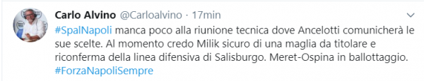 Il giornalista Carlo Alvino, tramite il proprio profilo Twitter ufficiale ha commentato quelle che potrebbero essere le scelte tecniche di Carlo Ancelotti in vista del match di oggi pomeriggio contro la Spal.