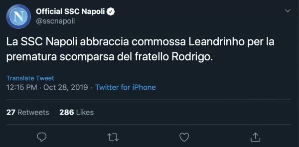 News Napoli calcio / È arrivata nelle ultime ore una tremenda notizia per Leandrinho, calciatore del Napoli in prestito all’Atletico Mineiro. Notizia che ci è giunta grazie al comunicato ufficiale del Napoli sul proprio profilo Twitter. Di seguito il tweet della società: