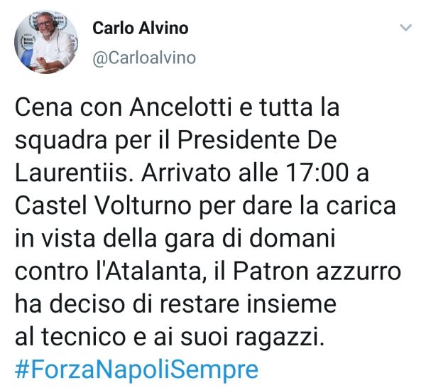 ULTIME NOTIZIE CALCIO NAPOLI – Carlo Alvino, collega di Tv Luna, tramite il proprio account Twitter ha reso nota la presenza del Presidente del Napoli Aurelio De Laurentiis a Castel Volturno. Secondo il collega, il patron azzurro resterà anche a cena con il gruppo in vista dell’importante gara di domani contro l’Atalanta. Ecco il Tweet: