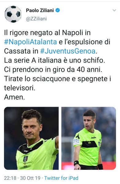 “Il rigore negato al Napoli e l’espulsione di Cassata in Juventus-Genoa. La Serie A è uno schifo. Ci prendono in giro da 40 anni. Tirate lo sciacquone e spegnete i televisori. Amen”.