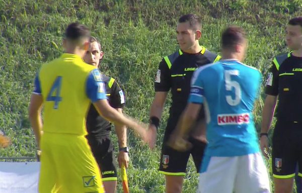 “Squalifica per tre giornate effettive di gara ed ammonizione per comportamento scorretto nei confronti di un avversario, per avere al 94′ del secondo tempo, a giuoco fermo, colpito un calciatore della squadra avversaria con un calcio alla tibia”.