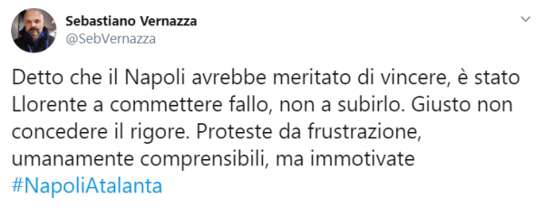 “Detto che il Napoli avrebbe meritato di vincere, è stato Llorente a commettere fallo, non a subirlo. Giusto non concedere il rigore. Proteste da frustrazione, umanamente comprensibili, ma immotivate”.