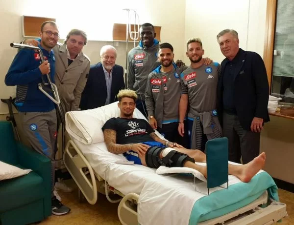 Ultimissime Napoli – Davvero un bel gesto, segno di coesione e sostegno. Una delegazione di calciatori del Napoli – come mostra il club con una foto pubblicata su Twitter -, accompagnati da Ancelotti, il d.s. Giuntoli e il presidente De Laurentiis, hanno fatto visita a Kevin Malcuit.