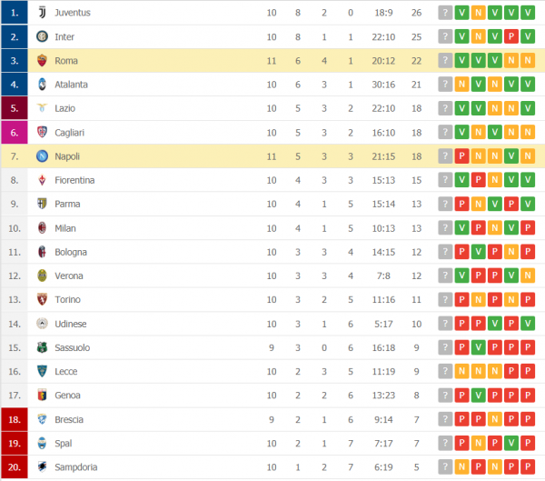 Il big match tra Roma e Napoli, valevole per l’11ma giornata di Serie A, finisce con la vittoria per 2-1 dei padroni di casa. Altro boccone amaro da mandar giù per gli azzurri, che non sono riusciti a trovare la vittoria all’Olimpico. Con questa sconfitta il Napoli resta a 18 punti e si posizione momentaneamente al 5° posto insieme a Lazio e Cagliari. Di seguito la classifica aggiornata.