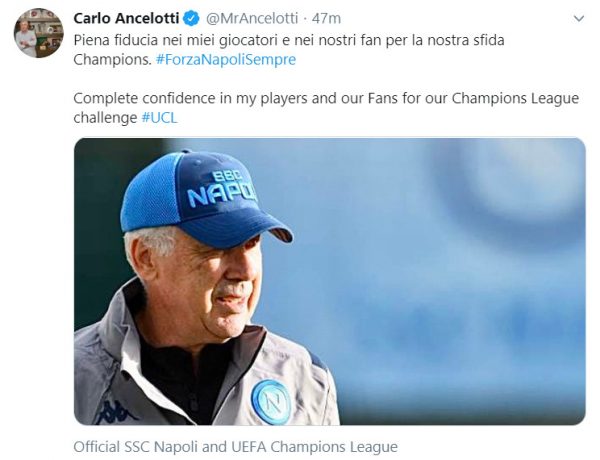 Carlo Ancelotti tramite il suo profilo Twitter ha dato la carica ai suoi giocatori in vista della gara di domani sera, Napoli-Salisburgo.