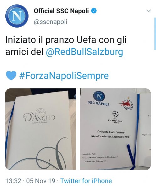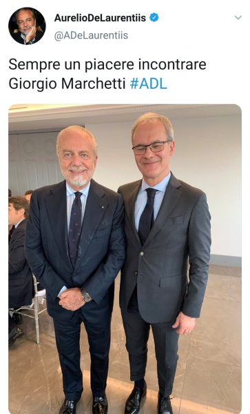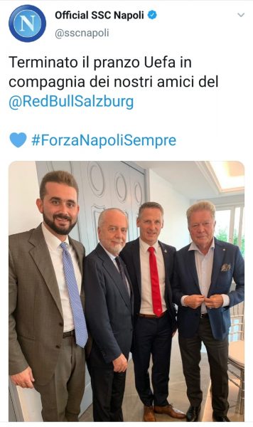 Si è concluso il pranzo UEFA tra Napoli e Salisburgo. Il Napoli ha celebrato la conclusione dell’incontro con la compagine austriaca tramite il proprio profilo Twitter. Aurelio De Laurentiis poi ha anche postato una foto con Giorgio Marchetti, l’uomo che ha sostituito Gianni Infantino come “uomo dei sorteggi” in Champions League.