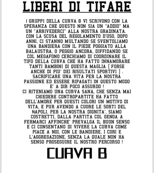 La Curva B lancia un segnale fortissimo. Con un volantino che verrà presto distribuito all’esterno dello stadio, il tifo organizzato dispone una protesta contro le nuove regole imposte dal Napoli per quanto riguarda le Curve. Sul volantino, si legge: