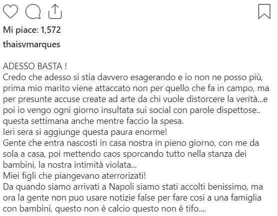 “ADESSO BASTA ! Credo che adesso si stia davvero esagerando e io non ne posso più, prima mio marito viene attaccato non per quello che fa in campo, ma per presunte accuse create ad arte da chi vuole distorcere la verità…e poi io vengo ogni giorno insultata sui social con parole dispettose.. questa settimana anche mentre faccio la spesa. Ieri sera si aggiunge questa paura enorme! Gente che entra nascosti in casa nostra in pieno giorno, con me da sola a casa, poi mettendo caos sporcando tutto nella stanza dei bambini, la nostra intimità violata… Miei figli che piangevano terrorizzati! Da quando siamo arrivati a Napoli siamo stati accolti benissimo, ma ora la gente non puo’ usare notizie false per fare così a una famiglia con bambini, questo non è calcio questo non è tifo…”.